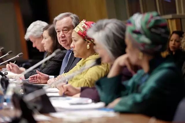 古特雷斯聆听并回应妇女地位委员会拉拉小分队代表的提问。图片来源:UN News