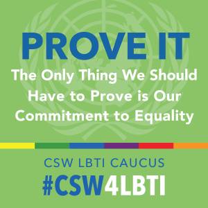 “证明——我们唯一需要证明的,是我们对平等的承诺。”——妇女地位委员会拉拉小分队的宣传图片之一。图片来源:CSW LBTI Caucus