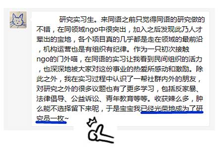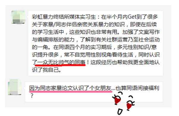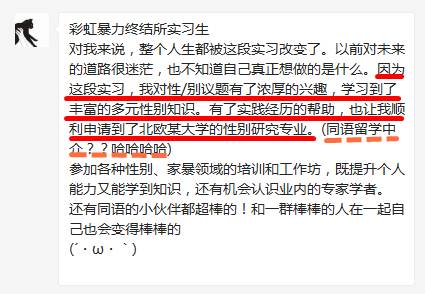 以上的聊天内容可以看到,曾经在这里的实习生们,有的已经在性别领域开始了更专业的研究和深造,有的已经成为其他NGO的骨干,还有的经过实习期后,表现优异,转成了同语工作团队中的小伙伴。