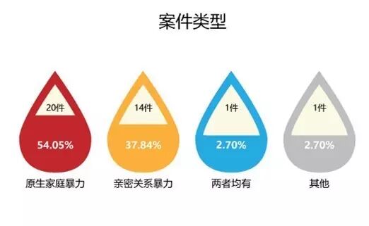 从案件类型上来看,原生家庭暴力有20件,亲密关系暴力有14件,分别占总数的54.05%和37.84%。两者均有的个案和其他情况个案各为1件,均占总数的2.70%。