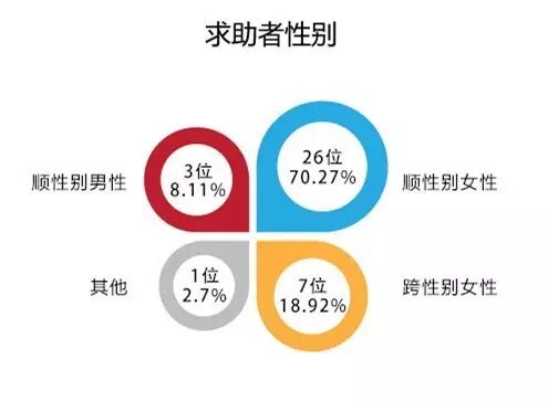从求助者性别分布上来看,顺性别女性求助者有26位,顺性别男性求助者有3位,分别占总数的70.27%和8.11%。在另外8名求助者当中,7人为跨性别女性,1人为其它,分别占总数的18.92%和2.70%。在处理的37个个案当中,暂无跨性别男性求助。