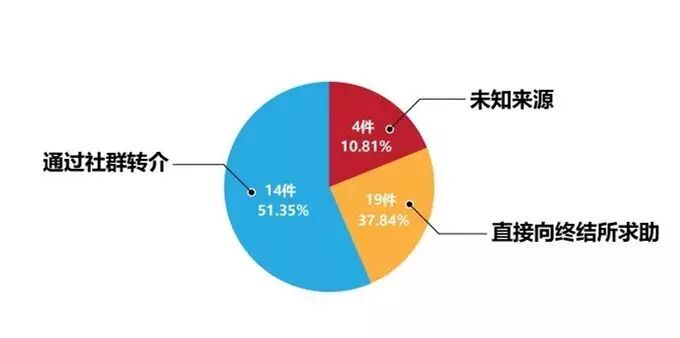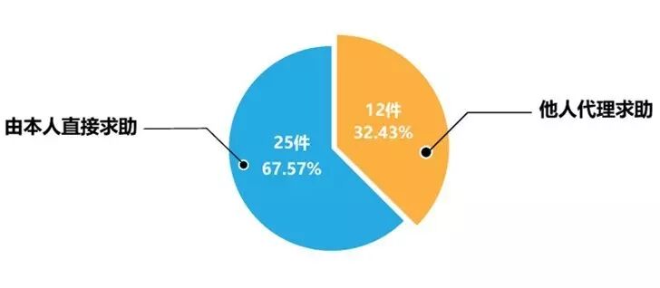 直接向终结所求助的有19件,占总数的51.35%;通过社群转介的案例有14件,剩余的4例个案为未知来源,分别占总数的37.84%和10.81%。在37个个案中,由本人直接求助的案例有25件,所占比例为67.57%,剩余的12位求助者为他人代理求助,占总数的32.43%。