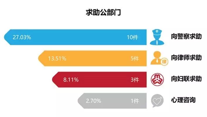 在求助公部门的19个案例中,向警察求助10件,占总数的27.03%。共有17次报警,3次明确出警记录,其中2件出警案件为自杀干预,并做有效干预;1次出警为正在施暴(到达后施暴者已离开)。