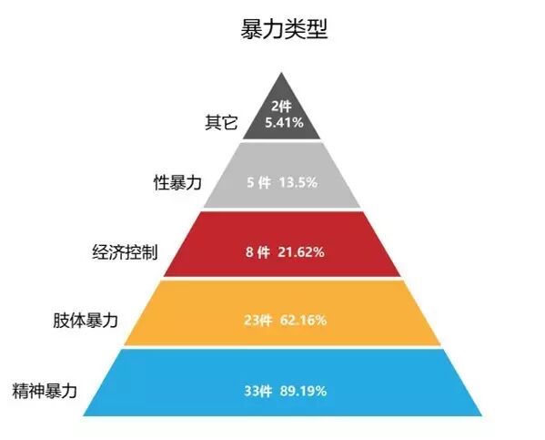 在处理的案件中,暴力类型也各有不同。其中涉及肢体暴力的案件有23件、精神暴力的33件、性暴力5件,各占总数的62.16%、89.19%和13.51%。涉及经济控制的有8件,占总数的21.62%。其它情况有2件,占总数的5.41%。