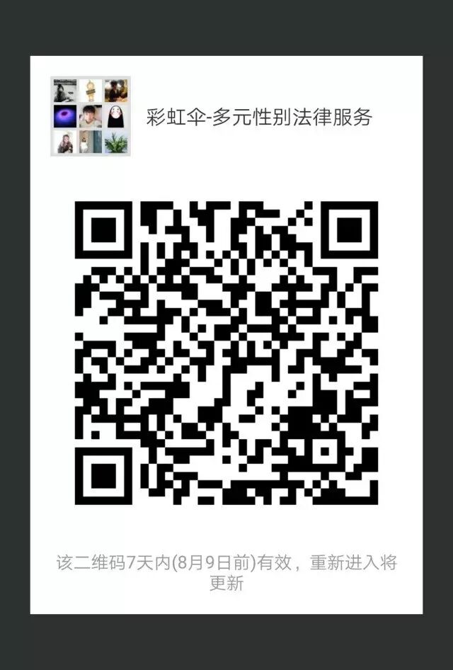 您可以通过扫描二维码进入彩虹伞-多元性别法律服务,第一时间了解活动信息。