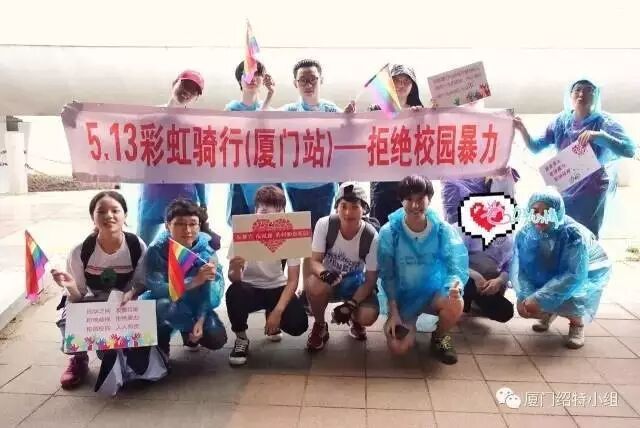 2017年5月13日,绍特小组在厦门地区开展了“彩虹骑行,拒绝校园暴力,反歧视”活动。经过一上午的培训和演练,志愿者们下午现身厦门大学的校园里,向路人介绍多元性别知识。骑行过程中下起大雨,志愿者们仍然热情满满,一边躲雨也不忘一边继续倡导。