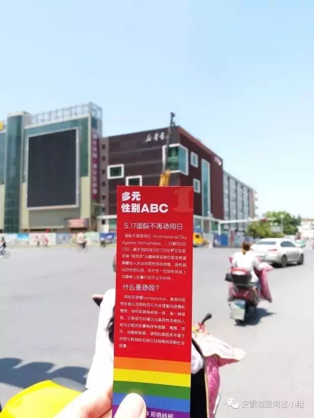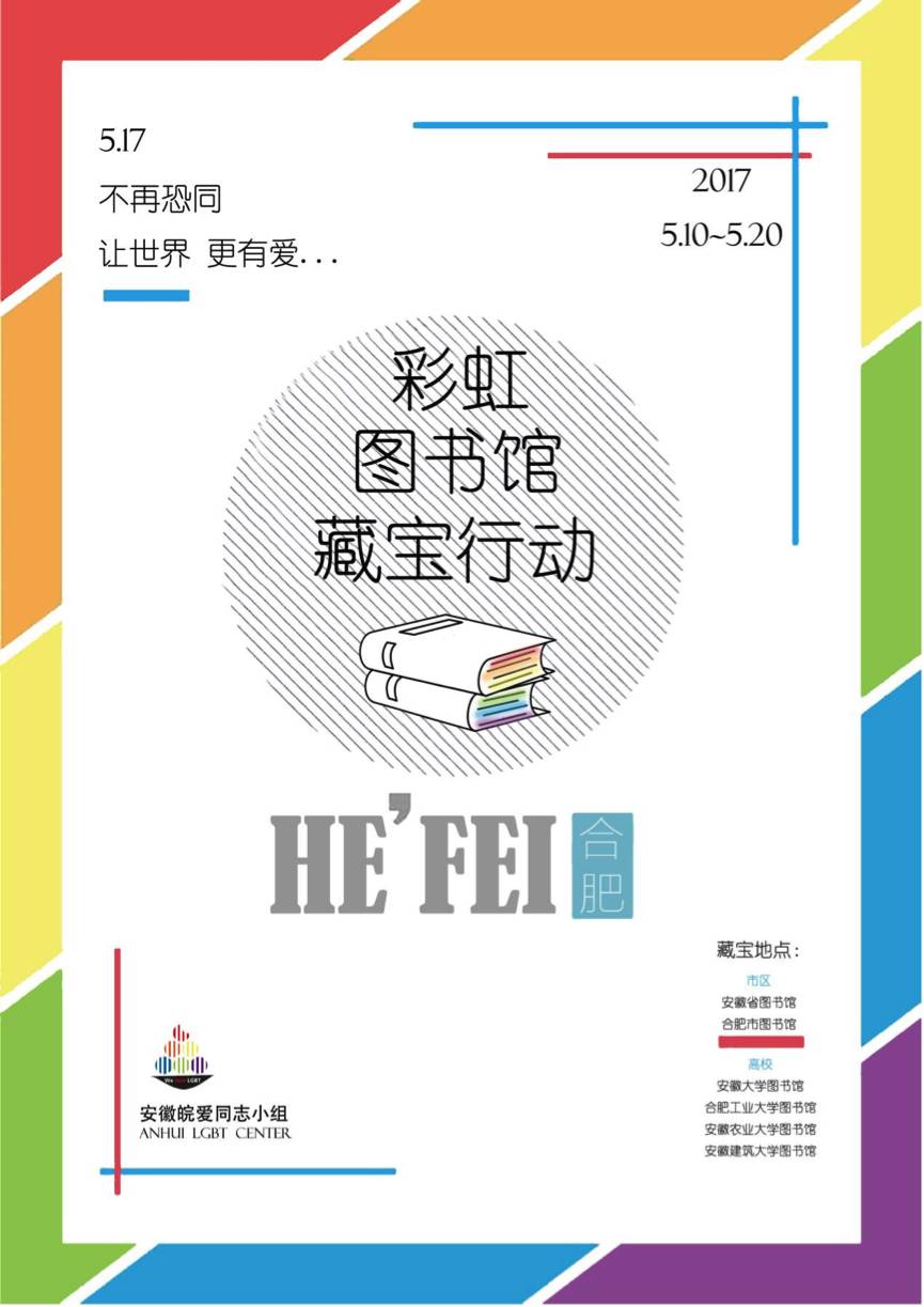 在517前后,安徽皖爱同志小组在安徽地区展开了有趣的图书馆藏宝行动,将印有多元性别知识的彩虹书签投放至书店和高校图书馆的书籍中,你有没有发现宝藏呢?活动期间,志愿者身披彩虹旗在合肥市最具有标志性的城市主干道之一长江路行进了约1公里。