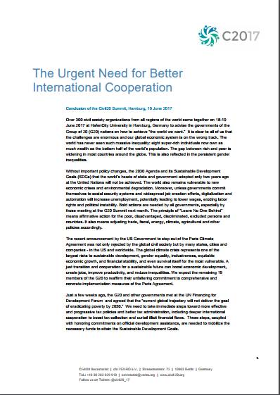 作为G20的配套会议,C20每年的产出为一份成果性文件——“C20会议公报”(C20 Communique),这份公报会被提交给G20,以传达民间社会在重要议题上的立场。实际上,除了会议公报以外,汉堡C20还同时产出了一份内容更为全面的“C20政策简报”(C20 Policy Briefs),就汉堡C20的六大议题向G20提出政策性建议。