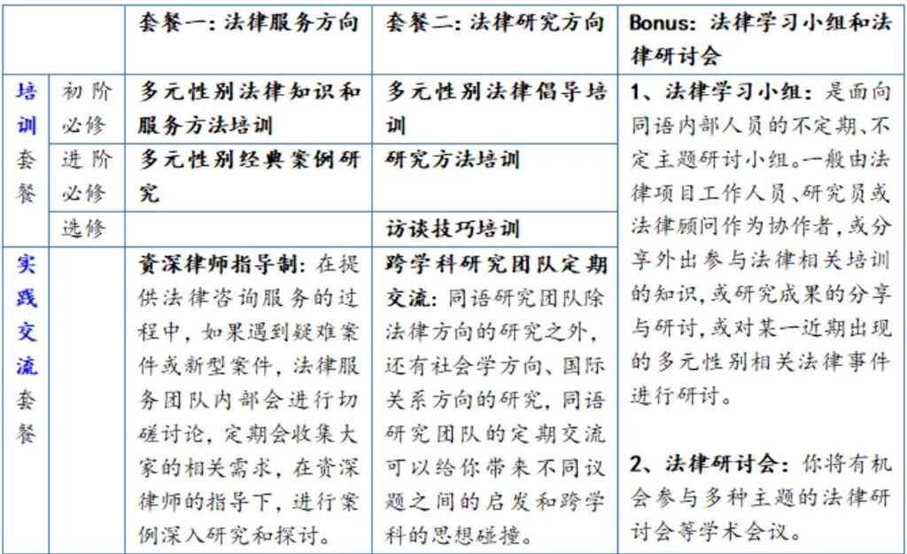 初阶阶段(即第一期实习期):迅速掌握基本的多元性别法律服务的方法和技巧,和/或了解多元性别法律倡导的内容与手段。