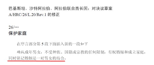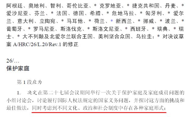 可以看出,这是对多元性别议题友善的国家,试图将多元家庭纳入联合国人权话语中的一次努力。于是,对多元性别议题抱有敌意的国家们提出了另一项修改建议(A/HRC/26/L.38):