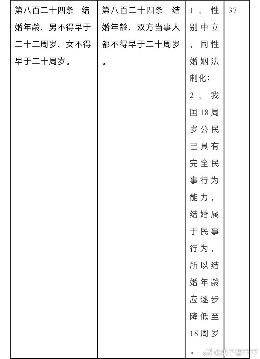 其实我认为孙文麟这条建议的本意,只是从性别平等的角度出发而已,如果男女法定婚龄不同,那么就会出现女同性恋伴侣二十岁即可结婚,而男同性恋伴侣、异性恋伴侣则要等到双方或一方二十二岁才可以结婚,这种规定属于没有合理原因的区别对待。