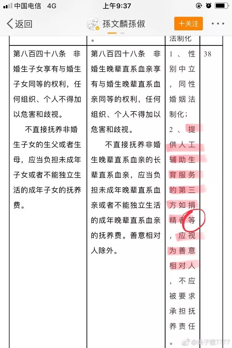 再回到孙文麟的建议,这条建议,我认为他完全是出于考虑到同性伴侣生育时需要有捐精者、捐卵者提供精子和卵子,而按照原法条,这些人会被认为是非婚生子女的生父和生母,从而被要求承担抚养责任,这样对捐精者和捐卵者都是不公平的。修改之后,只是免除了这些人的抚养责任,和ta们捐精者、捐卵者的身份相适应。