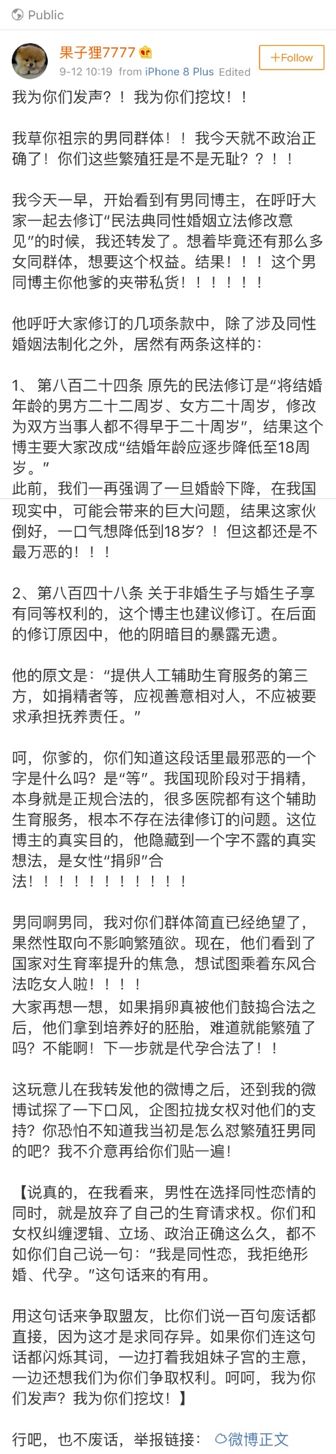 并不是说孙文麟提出的这一民法典同性婚姻家庭编立法建议没有问题,但正如他自己在文章中说的“4、提出不同的修法版本及建议,或提出关于同居扩大解释范围的倡议,或提出反对的意见,引起争论;”——他并非不接受不同意见,也并非认为自己的意见就是完美的,我们都可以提出自己的建议。况且官方的民法典婚姻家庭编提交建议的方式是一条一条提交建议,个人不认同的建议完全可以不提交,对他人提供的建议,也可以修改后作为自己的建议提交。果子狸7777实在是没有必要在网络上诛心、扣帽子,以及从(她推测)的个人“问题”上升到整个男同性恋群体的问题。