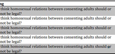 首先,据威廉姆斯研究所的研究,调查问卷使用的措辞值得注意。这是因为,不同的用词可能将受访者代入进不同的语境和话语体系(frames of reference)从而对调查结果产生影响。具体而言,虽然在语文上“同性婚姻”(same-sex marriage)和“法律允许同性情侣缔结婚姻”(legal recognition of marriages for same-sex couples)两个说法实际是同义的,但是由于“同性婚姻”在美国政治中是高度政治化、意识形态化的词汇[5] ,使用“同性婚姻”一词可能会引发受访者无意识的联想,进而对调查结果产生影响。威廉姆斯的研究也证实了,使用“同性婚姻”这一措辞会降低该调查中受访者对同性婚姻的支持率。不过,除了“同性婚姻”这类关键词之外,问卷问题的遣词造句(question wording)对结果几乎没有影响;问卷的整体语境(question context)对“是否认同同性婚姻”这一单个问题的影响也相对很小。