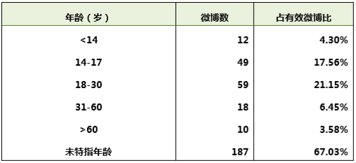 通过统计的结果可以看出,未特指年龄的报道占多数。在比较明确表明年龄区段的报道中,30以下的青年仍然占主要的部分,而在未特指年龄的报道中,中青年也基本是包含在其中的一部分。