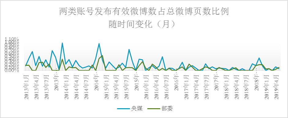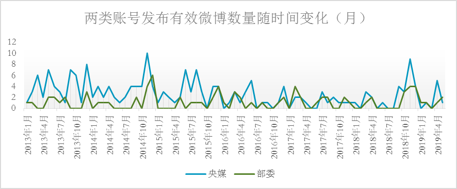 因为各账号注册并规律发布内容是从2013年起,所以我们研究了这116个账号于2013年1月1日至2019年5月31日发布的微博。