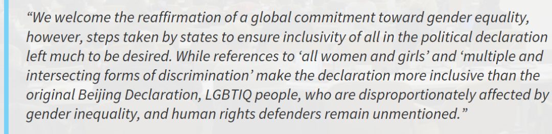 国际组织OutRight Action International的执行董事Jessica Stern对这次宣言的内容表示了遗憾,因为其仍然没有提及深受性别不平等问题影响的多元性/别群体(“LGBTIQ people, who are disproportionately affected by gender inequality, and human rights defenders remain unmentioned.”) [6]