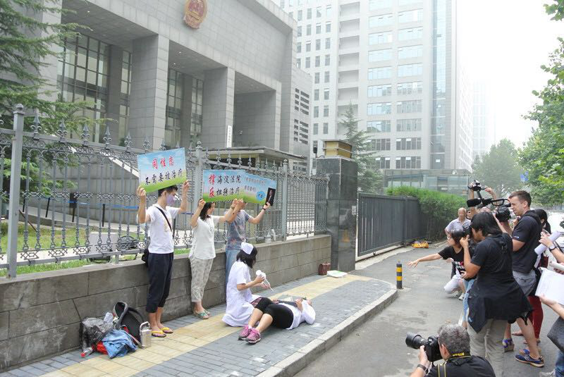 自 2014年7月31日上午9点半开始,本案在海淀区法院不公开开庭近四个小时。北京同志中心的志愿者们在法院门口焦急地等待,向路人发放传单,并时不时举起“同性恋不需要被治疗”的牌子。