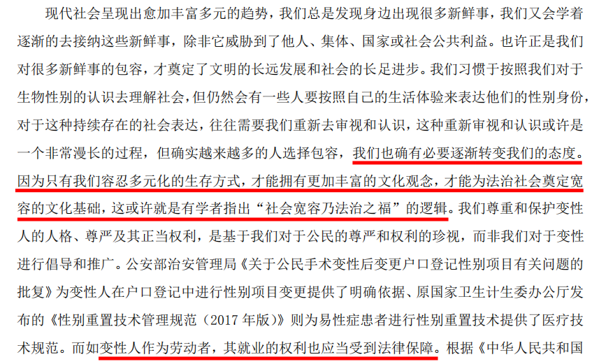 在这个案子的判决中,法官认可了性别重置手术的重要性,并要求企业及其员工以更加包容的态度对待跨性别群体,转变自己对于性别的刻板印象。通过这些表述,我们可以看到司法实践对于跨性别群体的理解、包容与支持,我们也希望这样的态度能够出现在更多案件中。