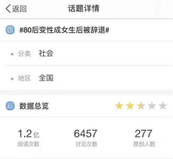 微博话题:#80后变性成女生后被辞退#