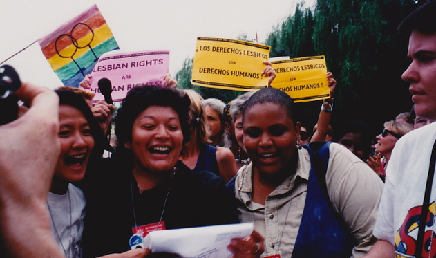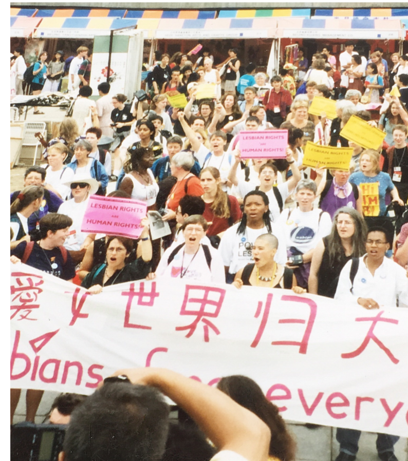 世妇会文件草案有几段话中的“性倾向”“性权利”“性自主”词汇被加了括号供政府代表进行辩论磋商,女同性恋群体在世妇会上展开活动,希望女同志的人权会被清楚地写进最终的文件里。为此,30多名参会拉拉现场制作了一张巨大的写着“Lesbian Rights are Human Rights”的横幅“偷渡”进了会场,以表示对南非组织代表Beverley Palesa Ditsie关于女同性恋权利的演讲的支持。
