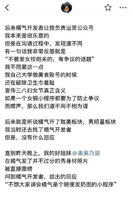 拉拉交友软件近期波澜不断,2020年骄傲月热拉Rela被下架,时隔数月后重新以The L的名字再度上架。最近,橘气小程序也因为照片尺度审查、女权言论审查等问题一度登上社群舆论风口浪尖。