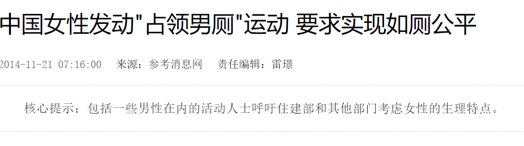 2012年,广州数名女大学生在越秀公园旁边的公厕上演了一场“占领男厕”的行为艺术。她们希望借此引起政府和社会对男女厕位不均衡问题的重视,消除女性在公共场所如厕排队现象。这一行动在当时收获了不少主流媒体的正面报道,也在门户网站引起了广泛讨论。