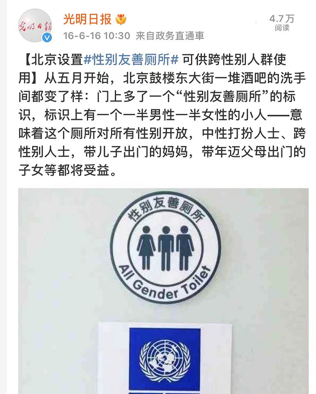 2016年,联合国妇女署、联合国开发计划署在北京的办公室及北京的多家咖啡厅和酒吧内的卫生间开始使用“性别友善厕所”标识,面向全性别人群开放厕所。