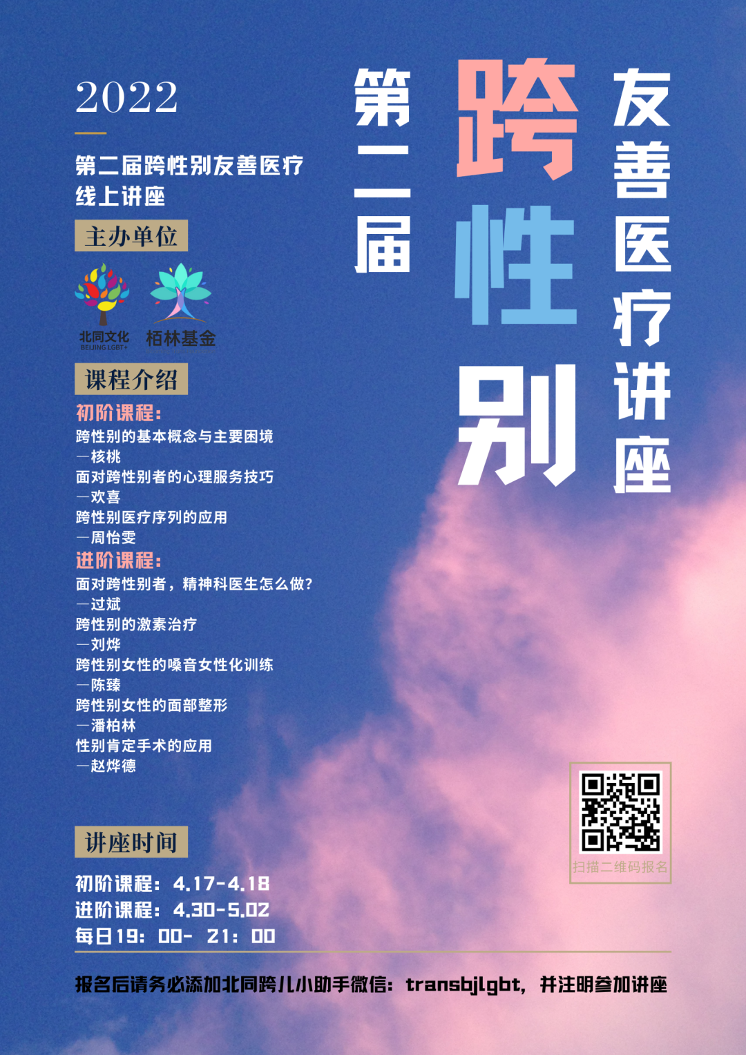 今年,北同继续推出跨性别友善医疗讲座,尝试增进跨性别社群与医疗人员群体的相互了解,携手推进跨性别医疗程序与服务的优质化和友善性。希望各位医疗从业者能从您的专业角度,提出对跨性别者医疗照护的观点,促进医疗程序与服务的完善,改善跨性别者的心理健康状况,降低自杀风险。