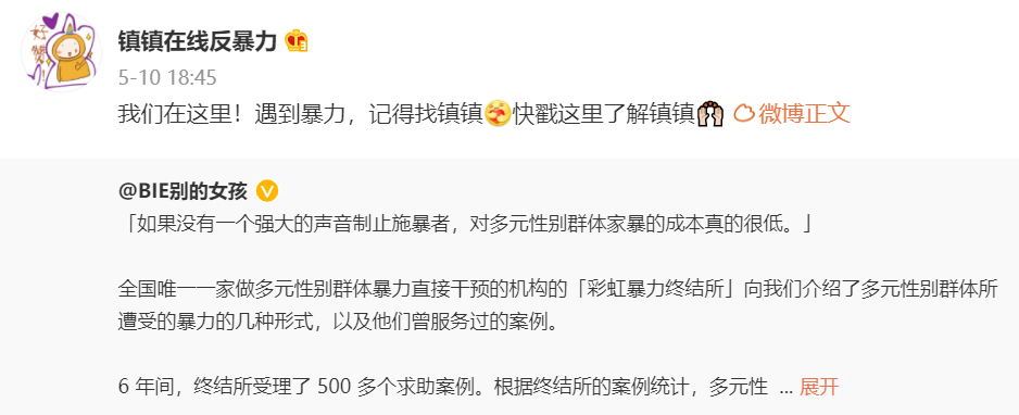 除了微信,微博也一直是我们的另一片网络自留地。在上面,我们与3w+的粉丝,以及各路关注多元性别议题的博主互动交流,提供赛博支持。@同语CommonLanguage @镇镇在线反暴力