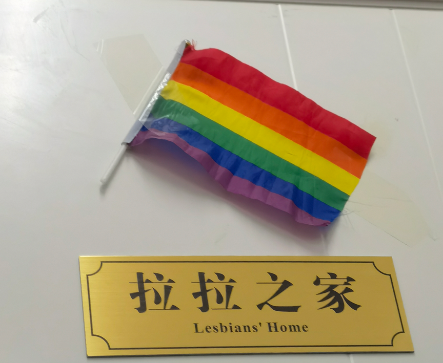 这个牌子是朋友w定做并送来给我的。彩虹旗是高中时,初恋女友赠给我的礼物。当时淘宝上还能买到。至于“拉拉之家”这个名字,也不知道谁起的。坦白讲有些名不符实,宿舍里真正是“铁血拉拉”的,倒也不在多数。总之叫着叫着就这么叫下了。有一段时间,宿舍微信群名甚至叫“性与性别论坛”。