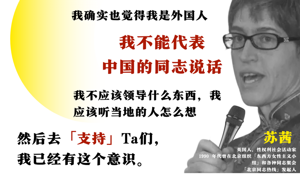 “在北京的时候我就觉得我是同志,我应该支持世界上的同志,争取Ta们的权利,我在中国我当然会参加这个同志运动。(但是)我确实也觉得我是外国人,我不能代表中国的同志说话,我不应该领导什么东西,我应该听当地的人怎么想,然后去支持Ta们,我已经有这个意识。…… (后来)我想,哦,那我原来支持中国的同志搞石墙活动是带有帝国主义的这个含义,就(像)这些,我觉得我(回英国后)思考了更多的(问题)。”
