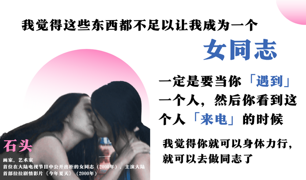 2000年8月,石头作为大陆的代表参加了凤凰卫视的「一点两岸三地谈」节目,并在节目中公开出柜。也是在同一年,石头主演了由李玉执导的纪实风格故事长片——《今年夏天》。这也是大陆第一部女同性恋剧情影片