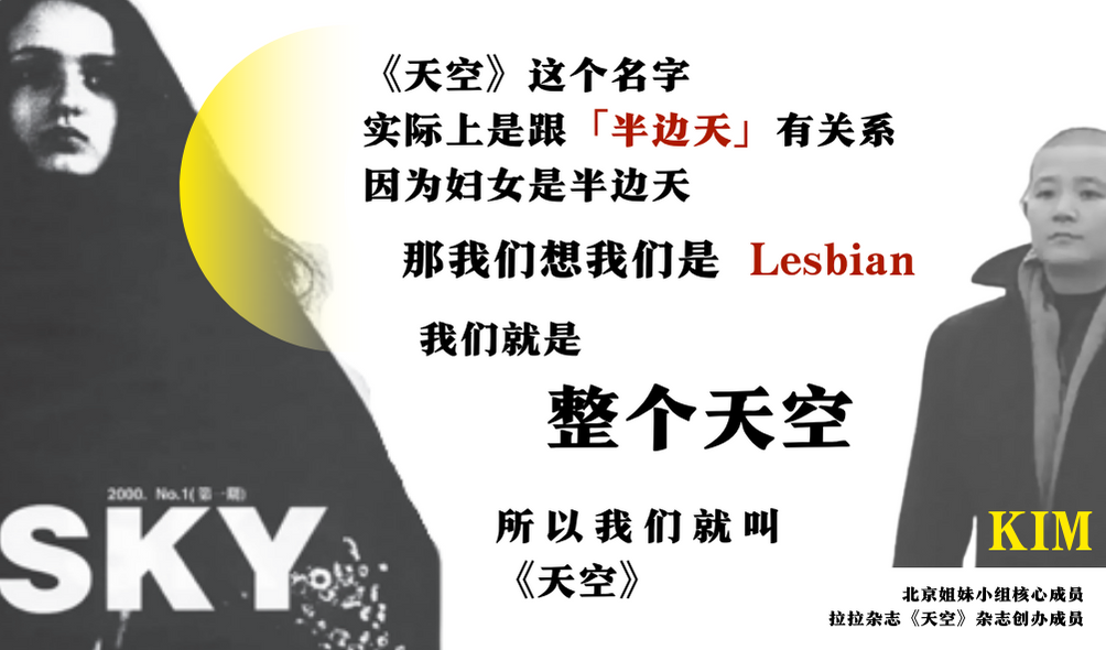 1998年11月,在「北京姐妹小组」的推动下,大陆拉拉社区的第一份杂志——《天空》逐渐办了起来。这份杂志不仅涉及许多拉拉情感方面的内容,也会提供一些社群相关的资讯,同时还开设有“论坛”栏目,以供大家讨论、交流一些共同关心的话题。尽管并没有固定的出刊日期,《天空》也主要是在拉拉社区的内部流通,但它是如此重要的一次尝试,让拉拉们能够发出自己的声音。