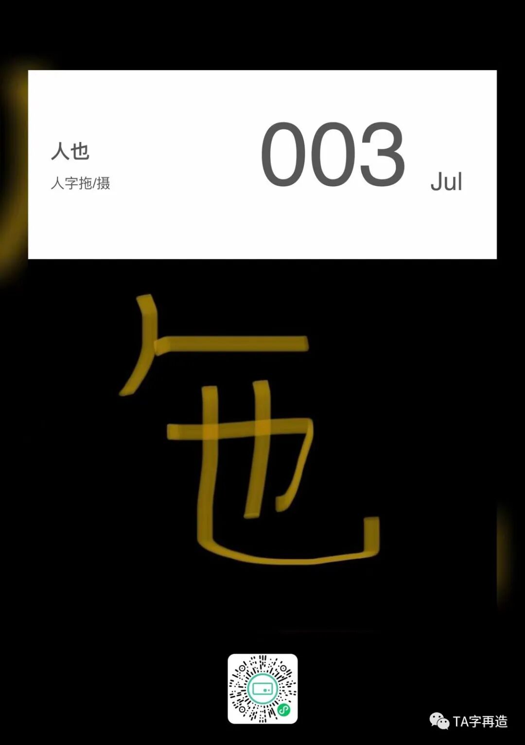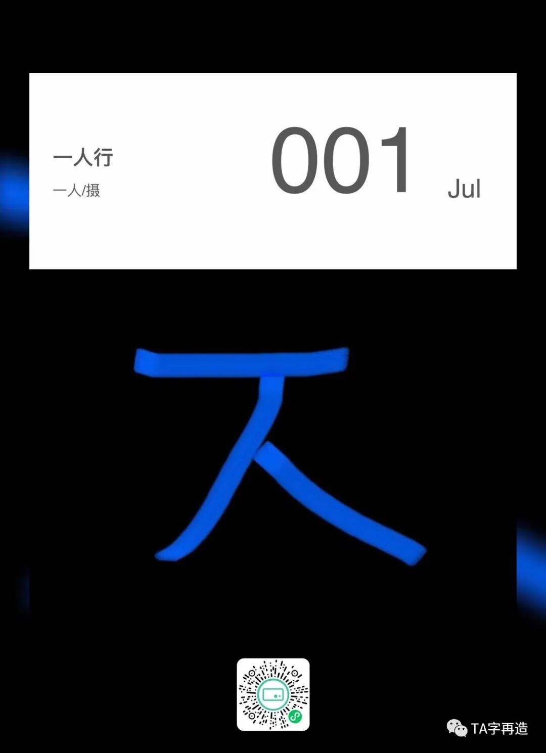 TA字是一个音符,没有性别指向,同时也没有形象的表达,我想用“一”和“人”组合,有个“大”字恰好音似,我创作的汉字是一个不断行动的个体。