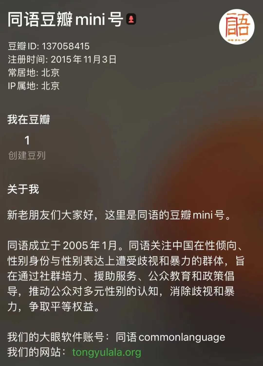 同语成立于2005年1月,关注中国在性倾向、性别身份与性别表达上遭受歧视和暴力的群体,旨在通过社群培力、援助服务、公众教育和政策倡导,推动公众对多元性别的认知,消除歧视和暴力,争取平等权益。