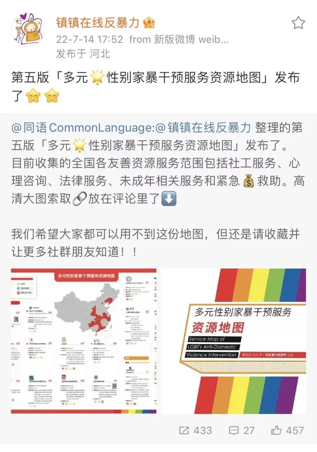 除了微信,微博也一直是我们的另一片网络自留地。在上面,我们与3.8w的粉丝,以及各路关注多元性别议题的博主互动交流,提供赛博支持。 @同语CommonLanguage @镇镇在线反暴力