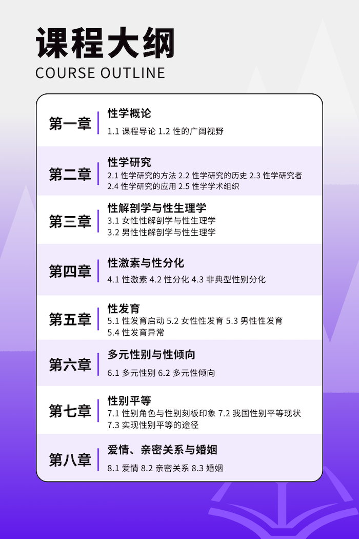 学习人类性学的基础知识是从事性教育研究、教学和传播的必要准备。刘文利教授在长达24年的国内外大学的教学生涯中,值得骄傲的一项工作就是为本科生开设了“人类性学”公共选修课,并受到选课学生的热烈欢迎。在刘文利从大学的教学岗位上退下来之前,她特别希望能把这门课程通过在线学习的形式继续开下去,让更多的人有机会了解人类自身发展的最重要的核心内容“性”。经过5年的准备、录制、审核、修改和申请上线,“人类性学”(上篇)终于在CCtalk平台和大家见面了。上篇包括8个单元,涉及性学研究、性解剖学、性生理学、性激素、性发育、性别、性倾向、爱情、婚姻等。